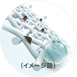 ウルトラファインバブルは、科学の力で発見された繊維のすき間より小さな「泡」。その大きさは、なんと直径1µm*(マイクロメートル)未満のナノサイズ。水中で発生させても、肉眼では透明な水にしか見えません。ところが、ウルトラファインバブルには、洗剤の洗浄成分(界面活性剤)の効果を高める力があります。しかも、ナノサイズの泡だから、繊維の奥にしっかり浸透して、汚れを落としやすくします。