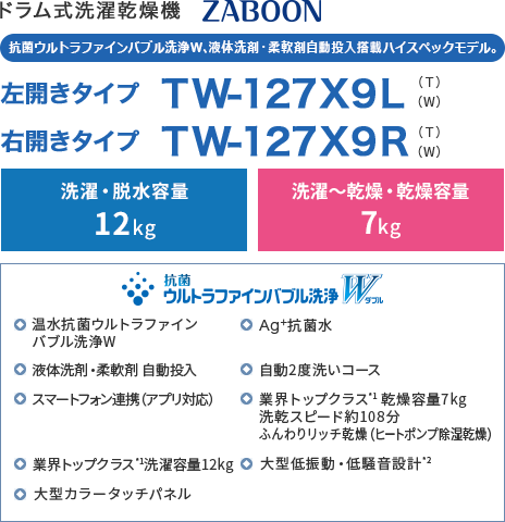 今回紹介したい「ZABOON ウルトラファインバブル」TW-127X9L はドラム式の特徴に加えて、ウルトラファインバブルという機能が加わっているのでより洗浄力に磨きがかかり、黄ばみや皮脂汚れにもとても強くきれいに洗浄が出来ます(^^♪