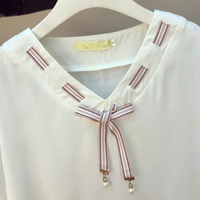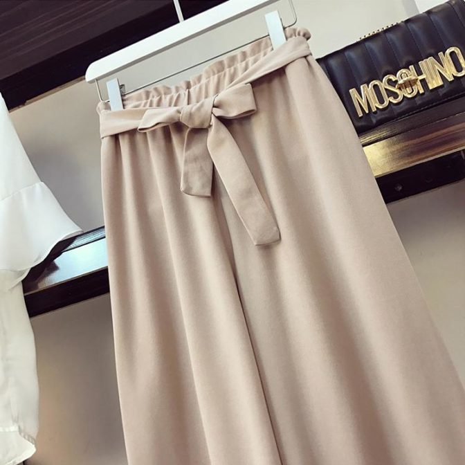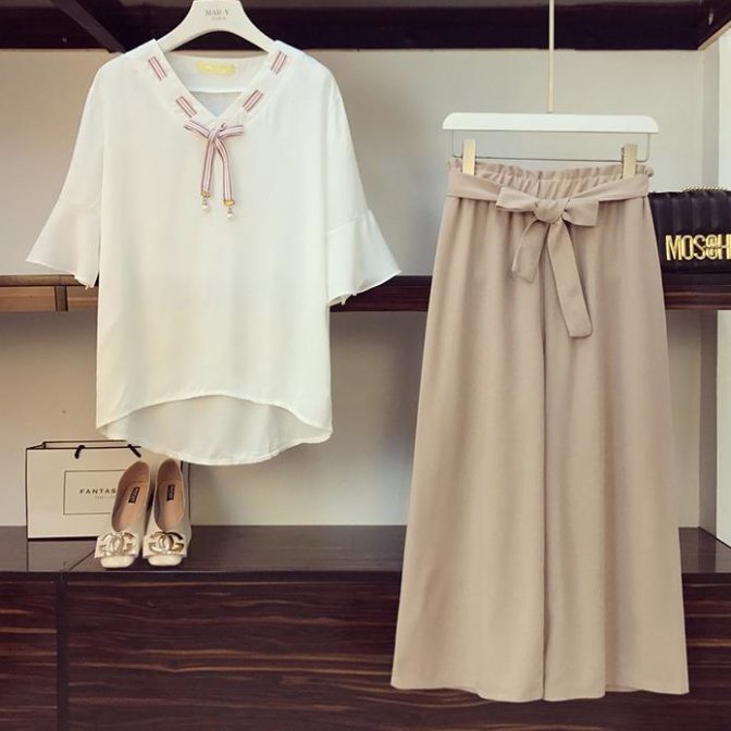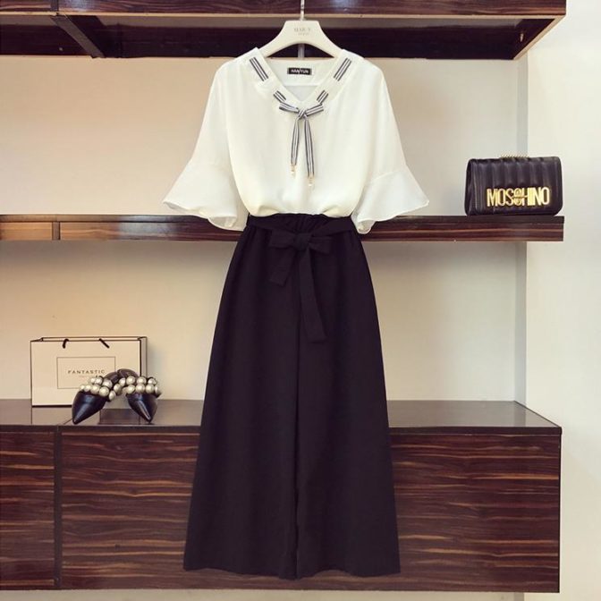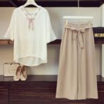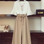 送料無料 韓国 ツーピース シフォンシャツ ワイドレッグパンツ リボン