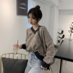 送料無料 韓国 セーター Vネック ストライプ 春 秋 長袖 オーバーサイズ ゆったり
