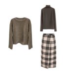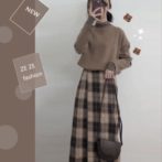 送料無料 韓国 ツーピース セーター ハイネック スカート チェック柄 秋 冬