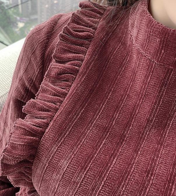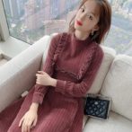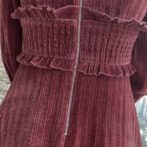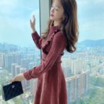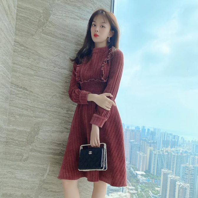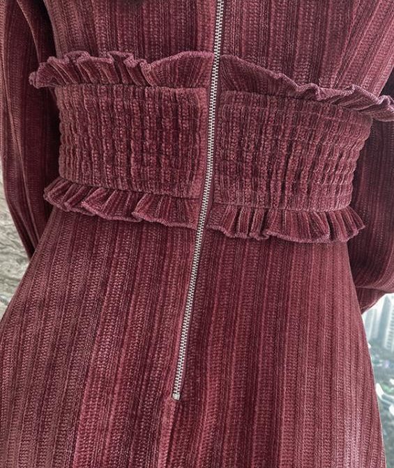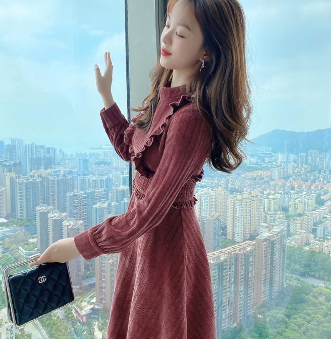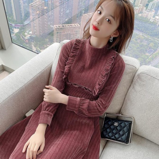 送料無料 韓国 ワンピース コーデュロイ 秋 冬 レトロ ラウンドネック ハイウエスト ミドル丈