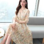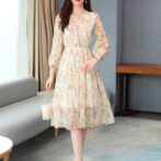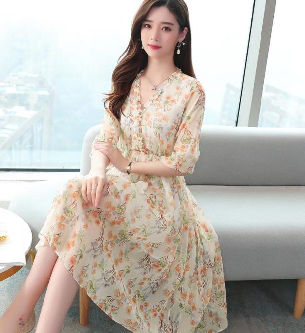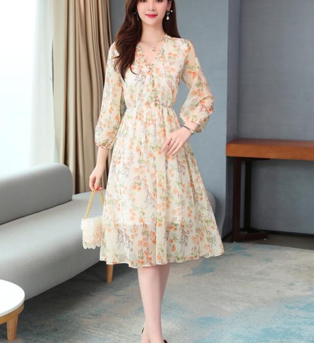 送料無料 韓国 ワンピース 春 長袖 シフォンドレス 花柄
